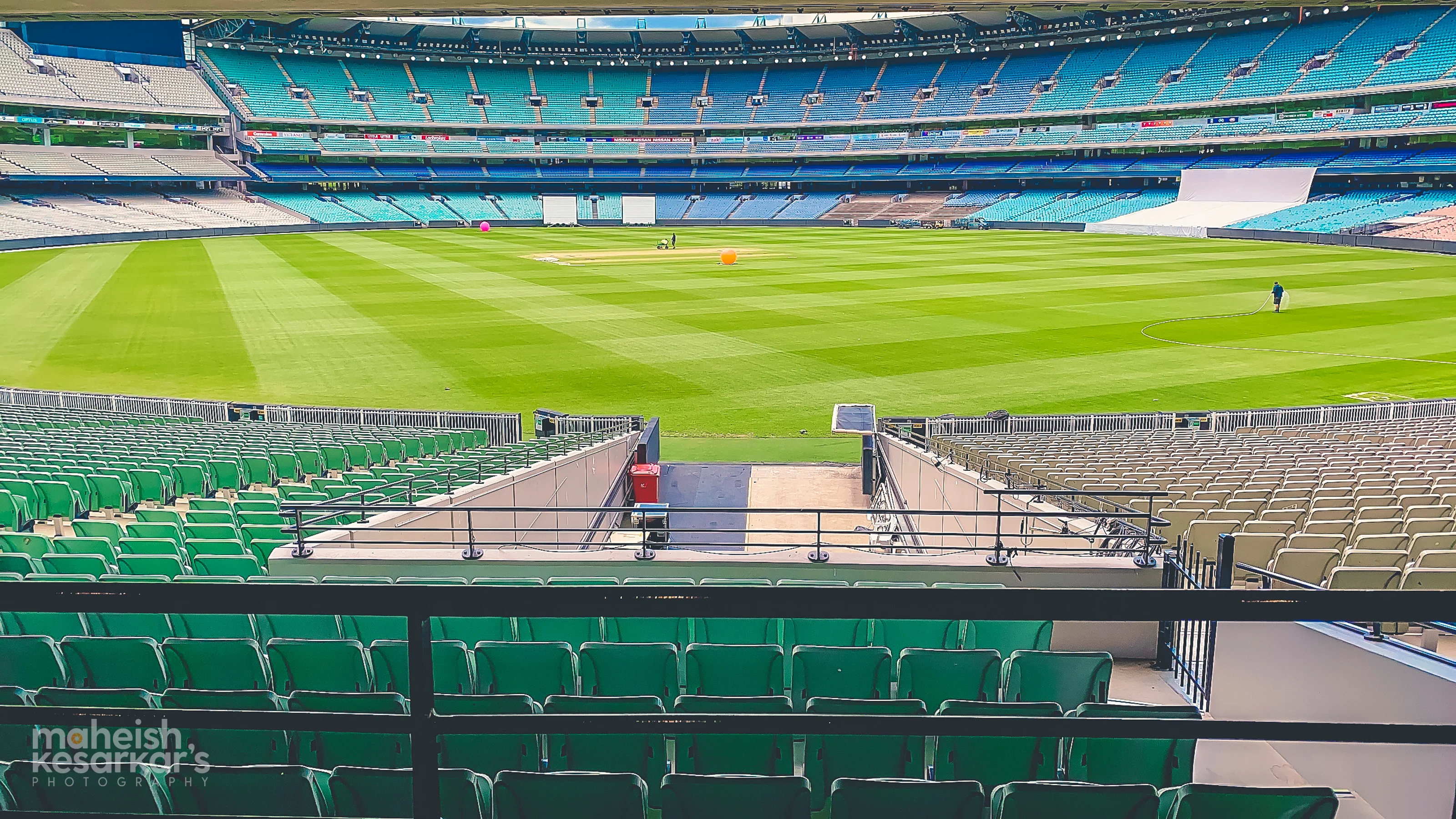 Melbourne, Victoria, Australia - 7th September, 2017: View of the green field and the empty chairs and seats on vast stands of the Melbourne Cricket Ground (MCG)