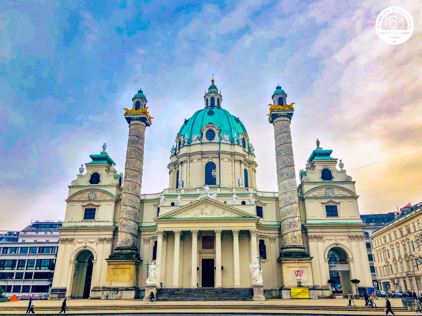 Karlskirche - Church of St Charles Borromeo and Trajan's Columns from Karlsplatz, Vienna Austria