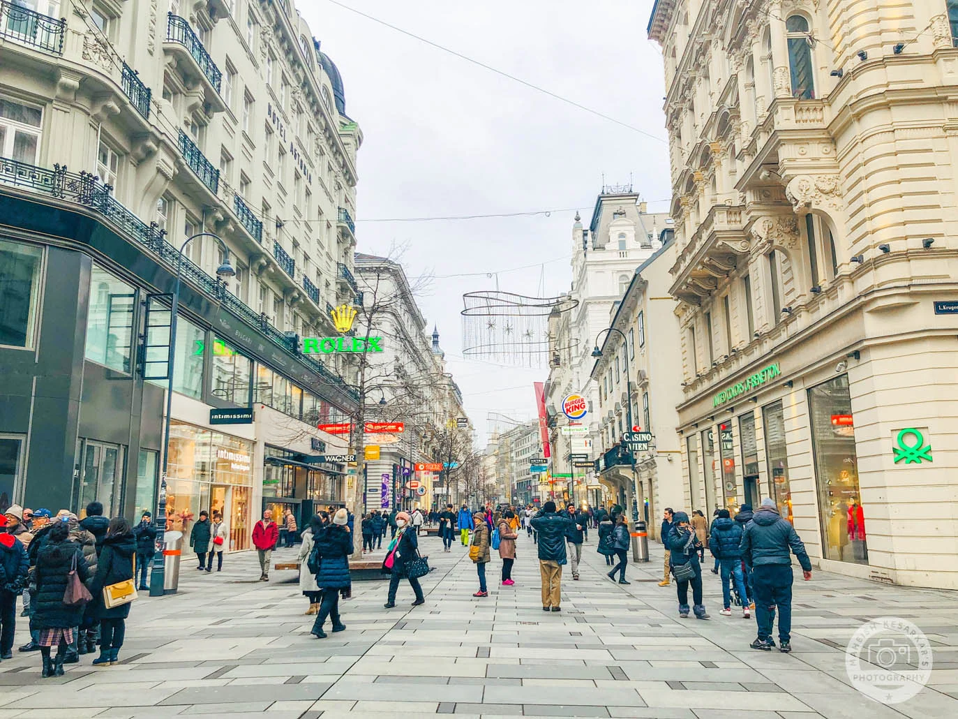 Crowded streets in the city center of Vienna, Austria. Colorful illuminated stores, shops and restaurants. Vienna, Austria, Europe