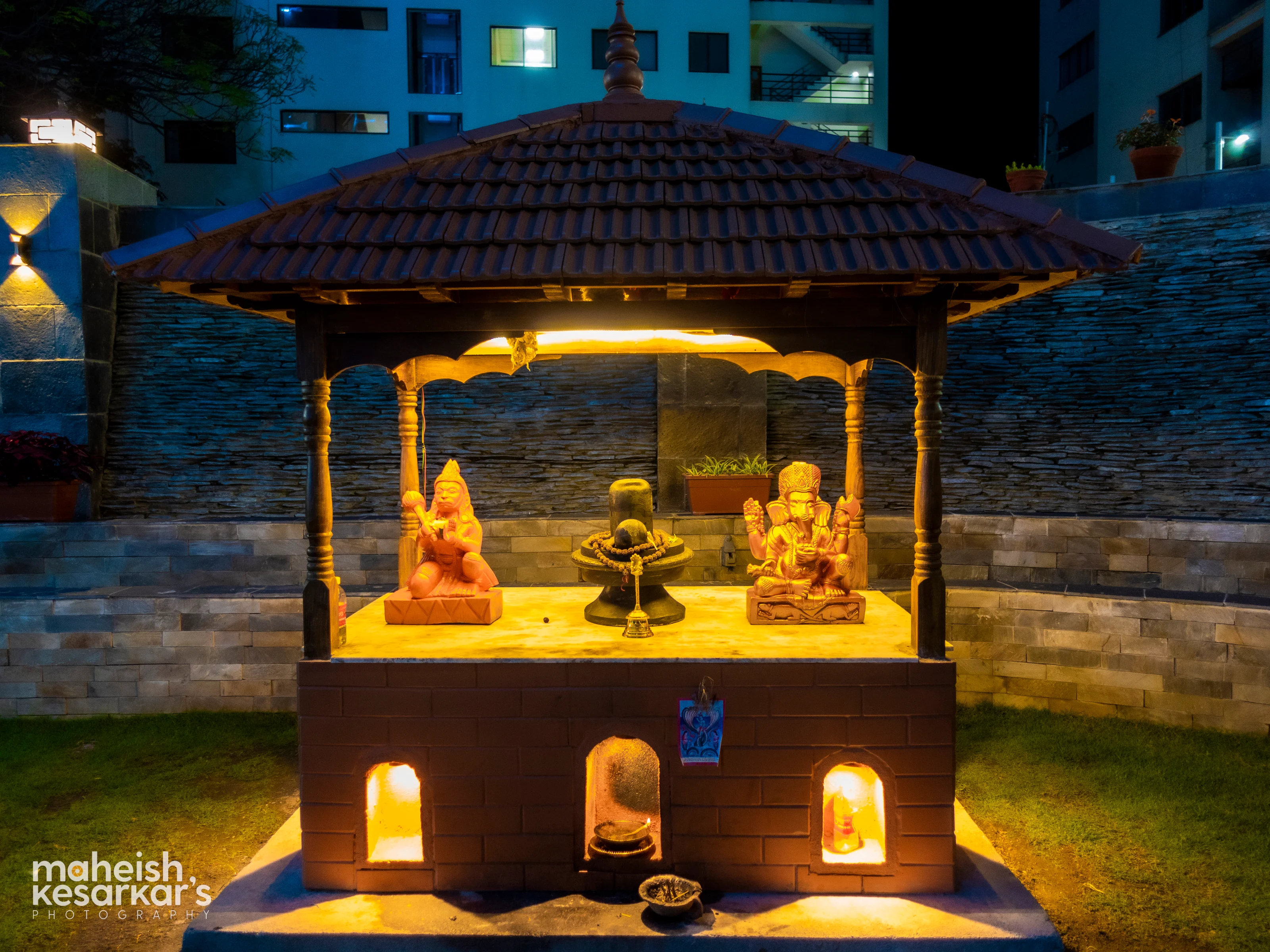 Beautifully Lit Hindu Temple Shrine with Lord Shiva, Ganesha, and Hanuman Idols