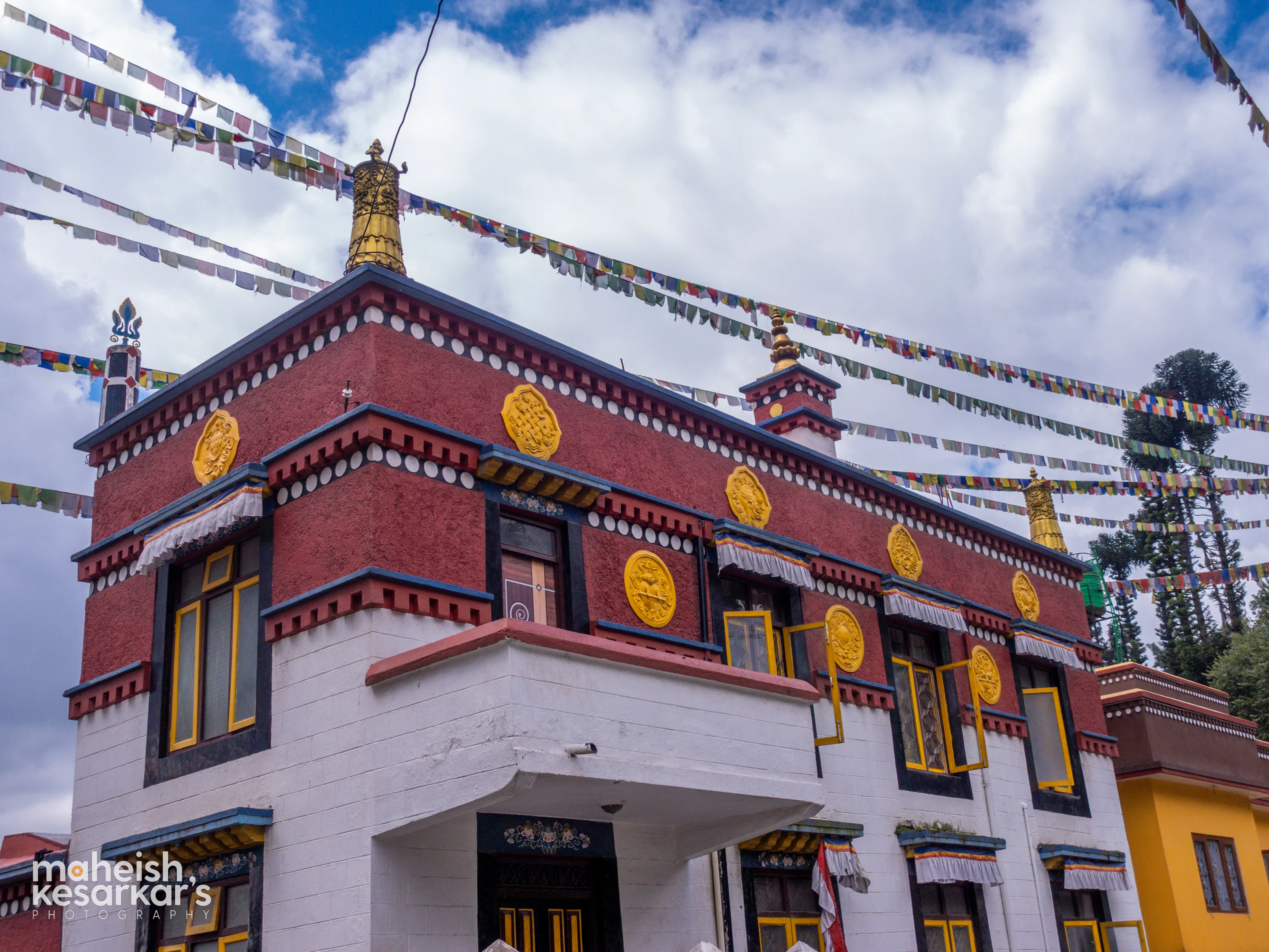 Colorful Tibetan Buddhist Monastery with Prayer Flags Under a Cloudy Sky