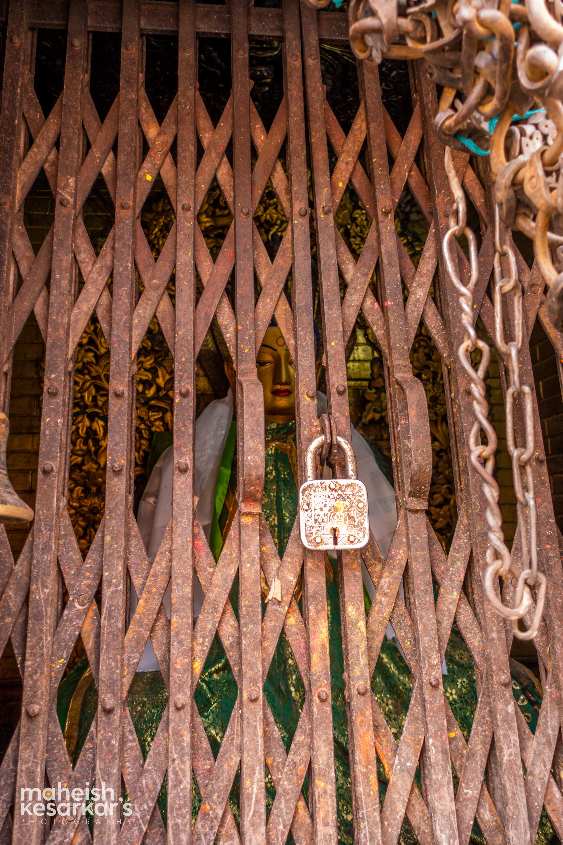 Locked Buddha Statue Behind Bars – Sacred Shrine at Swayambhunath, Nepal