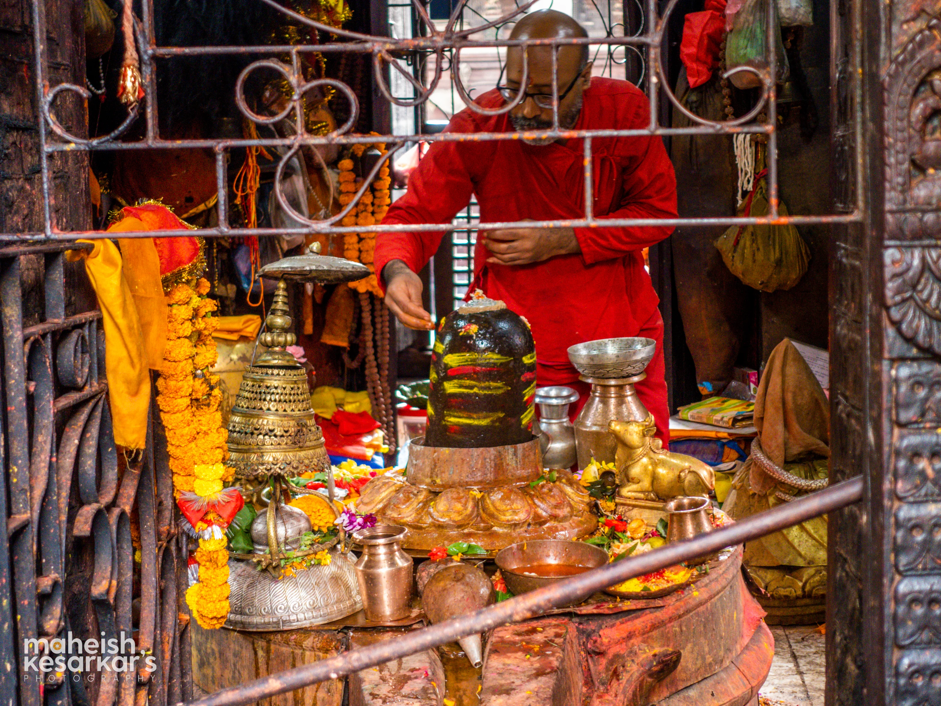Hindu Priest Performing Shiva Lingam Puja at a Temple in Nepal